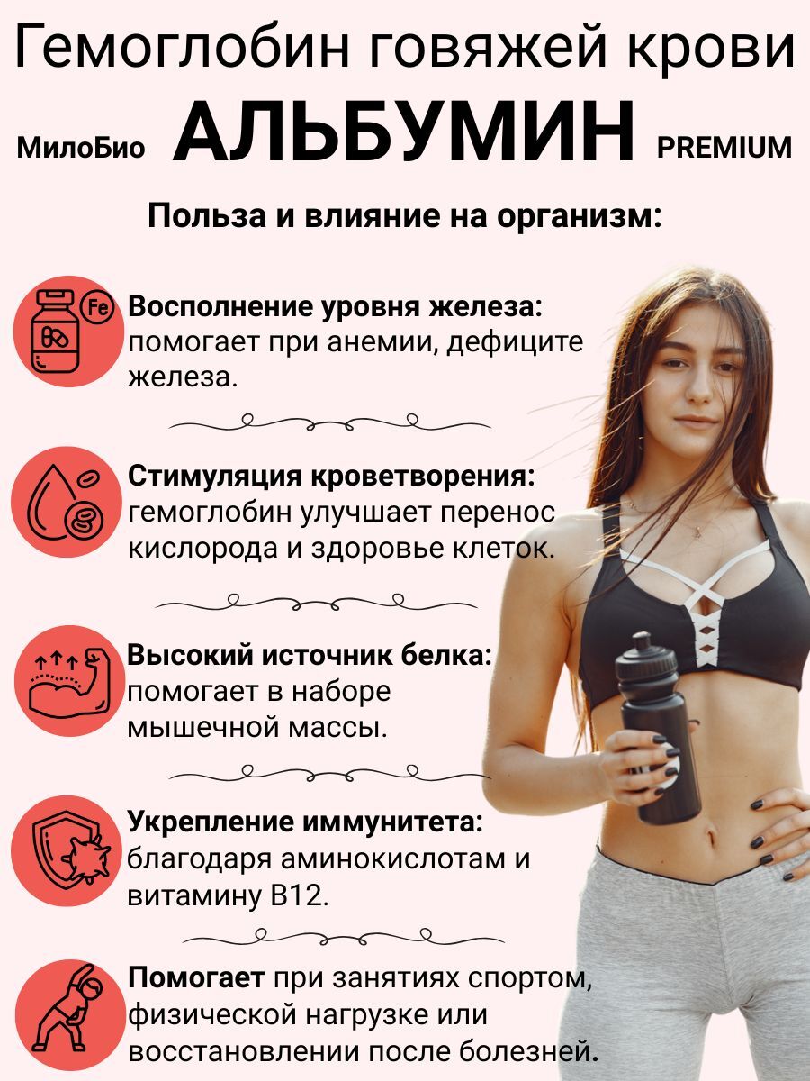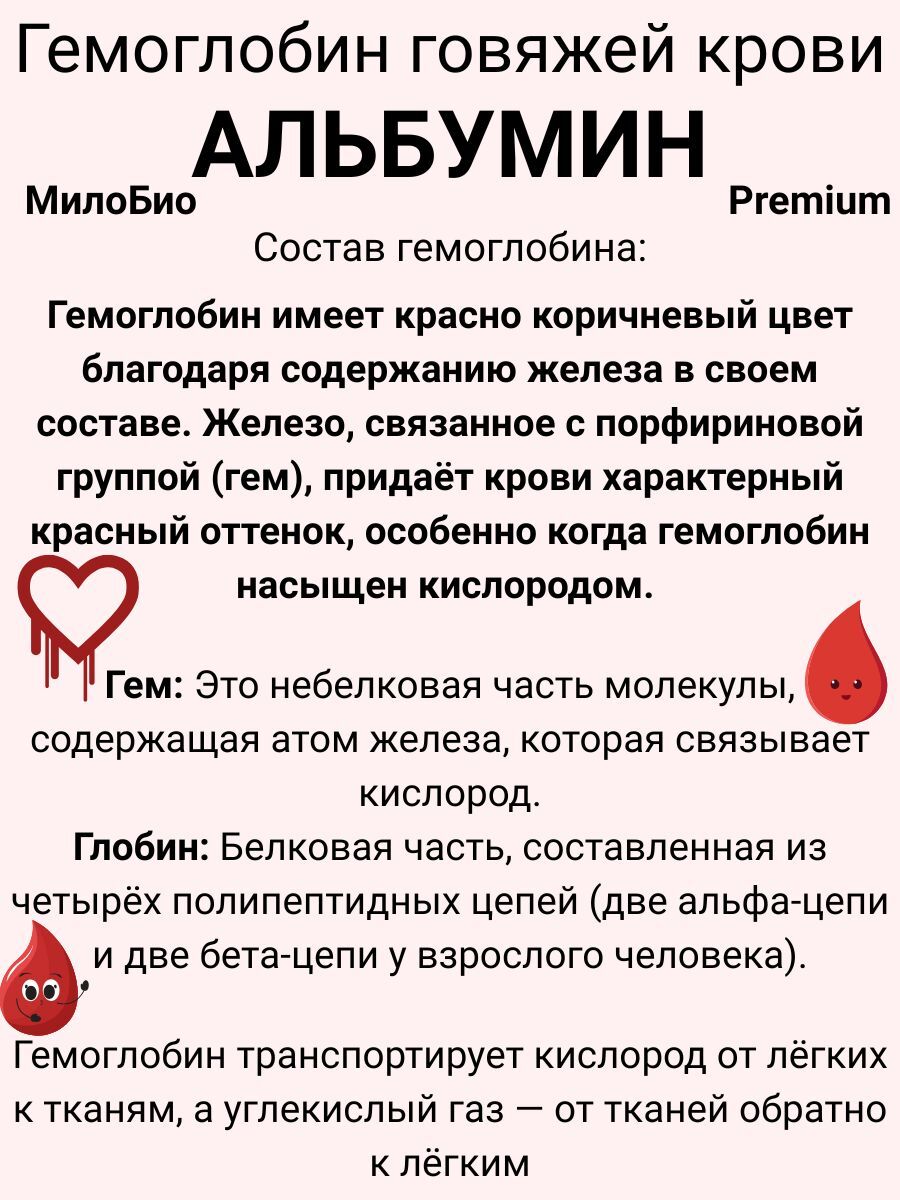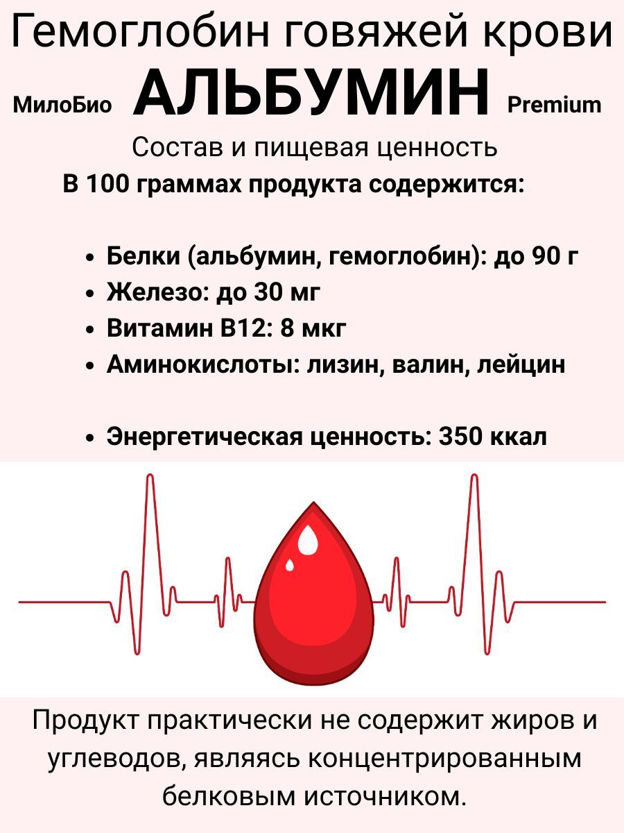 Гемоглобин Альбумин 1кг пищевой МилоБио — натуральный белковый порошок из сушеного говяжьего гемоглобина. Применяется для производства колбас и паштетов. Источник полноценного животного белка, который легко усваивается организмом и подходит для восстановления сил после физических нагрузок.