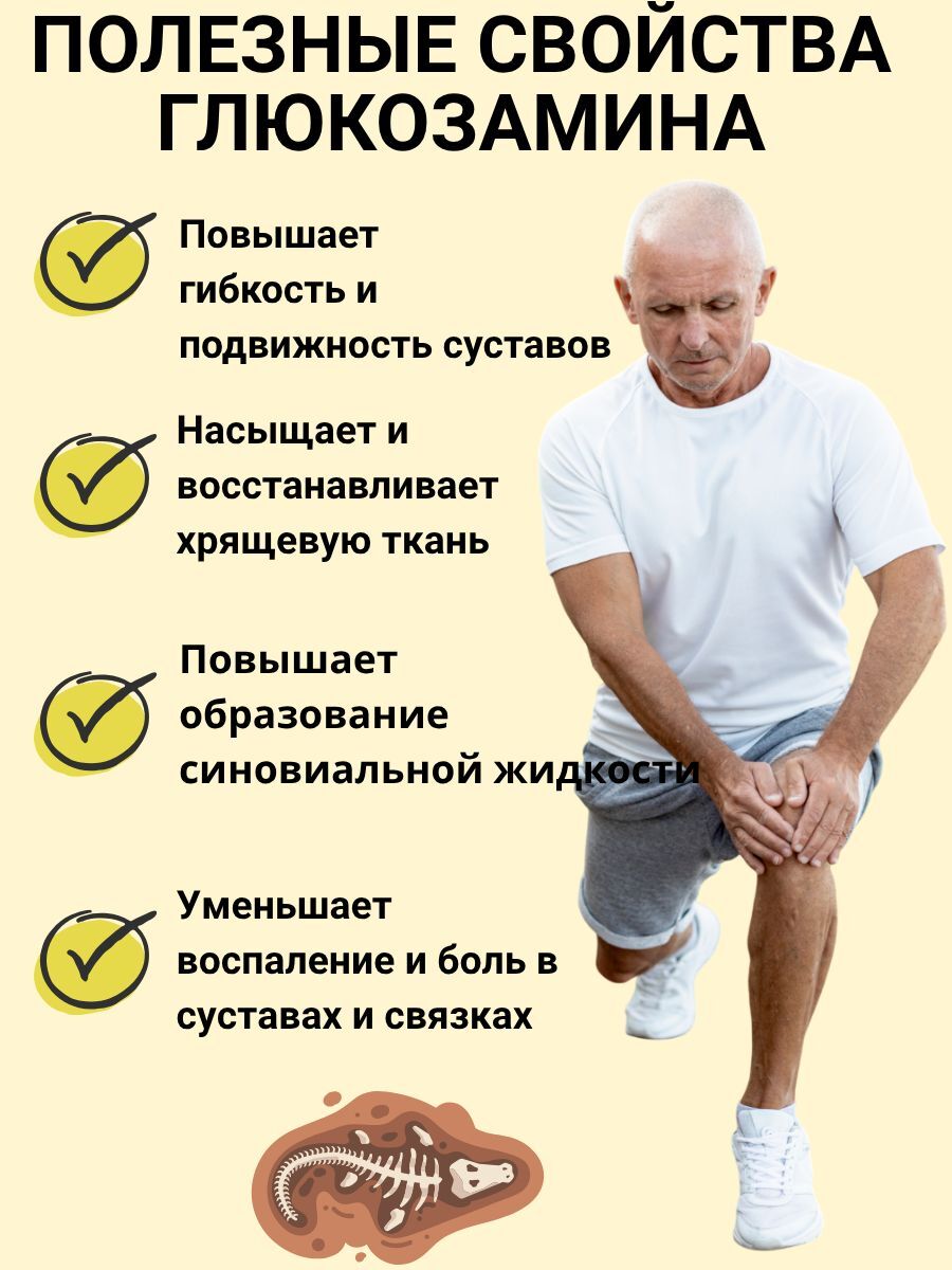 Поддерживает здоровье суставов и связок благодаря натуральному действующему веществу — глюкозамину сульфату. Идеален для людей, испытывающих дискомфорт при физической активности или возрастных изменениях соединительной ткани.