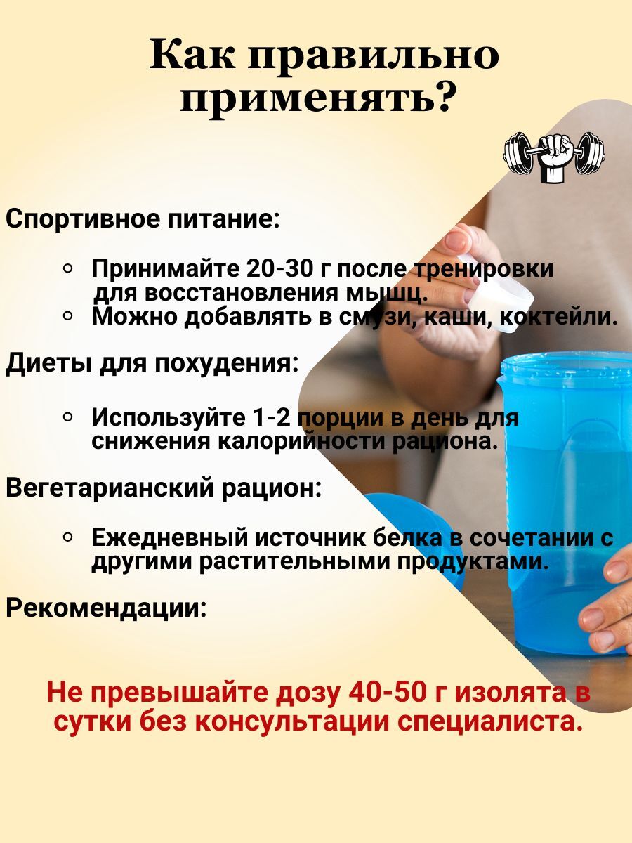 Этот вид растительного протеина особенно подходит спортсменам, которые придерживаются вегетарианской или веганской диеты. Также изолят служит отличным средством для компенсации недостатка белка в питании.