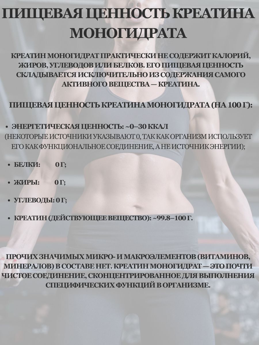 Креатин моногидрат практически не содержит калорий, жиров, углеводов или белков. Его пищевая ценность складывается исключительно из содержания самого активного вещества — креатина.