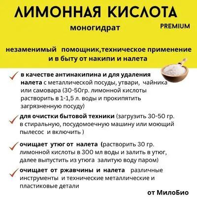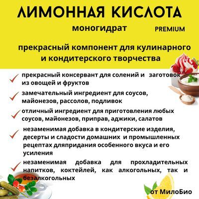 Лимонная кислота - это пищевой ингредиент, который получил широкое применение в пищевой промышленности. Это прекрасный натуральный консервант и регулятор кислотности, часто применяется в качестве добавки в различные блюда и для придания кислого вкуса блюдам. В пищевой промышленности лимонная кислота применяется как добавка Е330, антиоксидант и регулятор кислотности, а так же для консервации, для придания кислого вкуса блюдам, для гашения соды вместо уксуса. В быту используют как безопасное чистящее средство, для удаления накипи или тёмного налёта со старого серебра. В домашней косметологии с лимонной кислотой делают кремы, лосьоны, различные косметические средства и бомбочки для ванн.