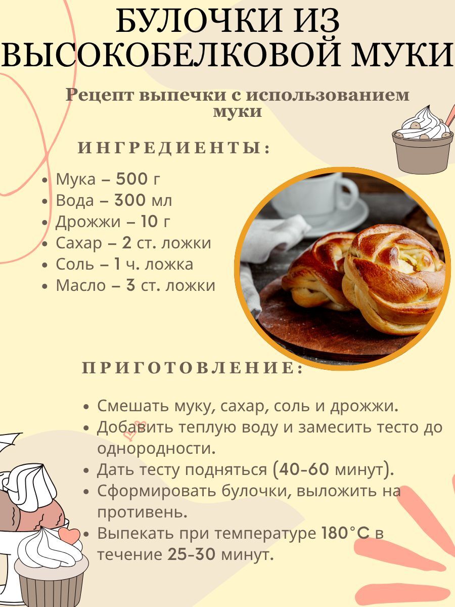 Мука высокобелковая пшеничная - это продукт, который можно использовать в различных рецептах. Она подходит для выпечки хлеба, блинов, пирожных и многого другого. Благодаря своей высокой белковости она также может использоваться как добавка к смузи или йогурту.