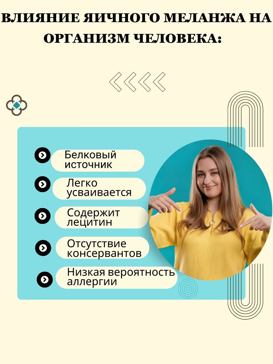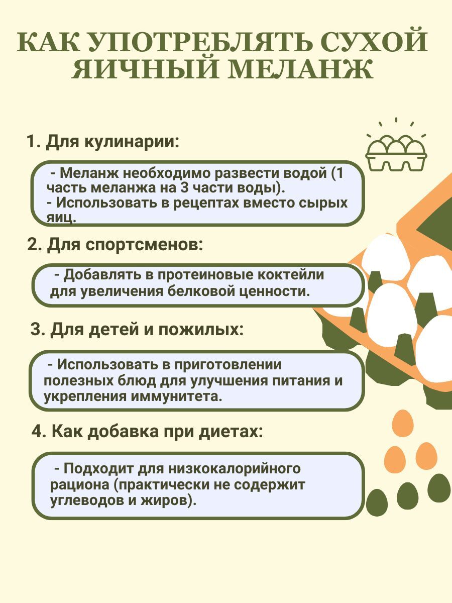 Сухой яичный меланж — это универсальный продукт, который сочетает в себе:- Высокую пищевую ценность благодаря белковому, аминокислотному и витаминному составу.